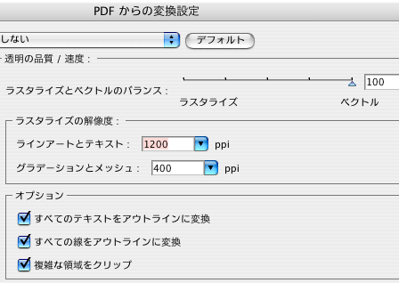 透明部品などが使用されているPDFは、これで多少安全に開くようになりますが、透明が使用されている部分はアウトラインされます。