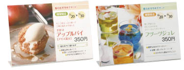 お店のサイドメニューやおすすめの品を印刷してテーブルに備えておけば、注目率があがります。