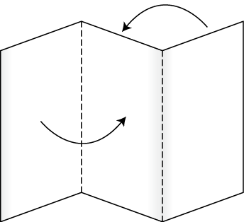 山折りと谷折りを一回ずつします。仕上がりを上から見ると、折り目が「Z」に見えるので、別名「ゼット折り」とも呼ばれることもあります。(下図はA4サイズの場合)